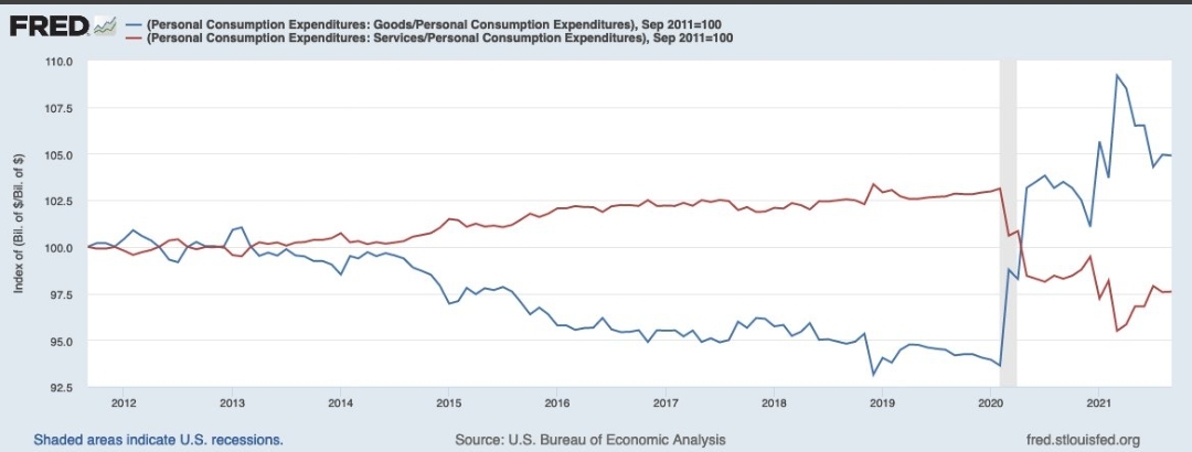 Fino al 2020, i servizi ammontavano al 30%-50% in più della spesa per i beni. Questo divario ha iniziato a ridursi, e addirittura ad invertirsi, con l’evoluzione della pandemia e della seguente ripresa economica. Ecco la prima delle anomalie dell’ultima recessione. Il divario tra la spesa per i servizi e quella per i beni è stato causato principalmente dall’intervento del governo. Costrette a casa, le persone hanno cominciato ad acquistare beni, soprattutto quelli durevoli. Inoltre il governo ha sostenuto la spesa dei consumatori con stimoli fiscali massivi.