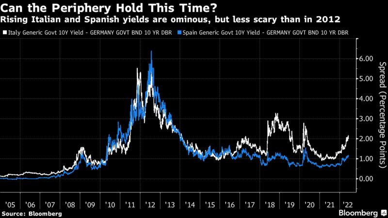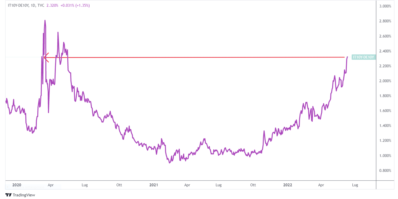Sebbene siano necessari tassi più elevati per rallentare il ritmo record di inflazione nel blocco, è probabile che essi danneggino maggiormente i paesi più indebitati della regione. Lo spread BTP-Bund dovrà allargarsi ulteriormente per convincere la BCE ad intervenire questa volta. L’ultima movimento al rialzo dei rendimenti ha spinto il premio delle obbligazioni italiane rispetto a quelle tedesche vicino alla soglia di 250 punti base, un livello che ha spinto la BCE a iniziare ad acquistare obbligazioni a marzo 2020.