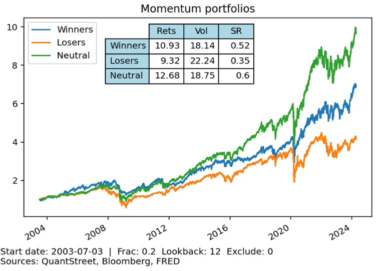 - Lungo Termine (24 mesi): I vincitori continuano a superare i perdenti, ma con margini ridotti. In alcuni casi, i portafogli neutri hanno prestazioni comparabili o superiori rispetto ai vincitori. Questo suggerisce che in alcuni contesti un approccio più equilibrato potrebbe ridurre il rischio senza sacrificare il rendimento.