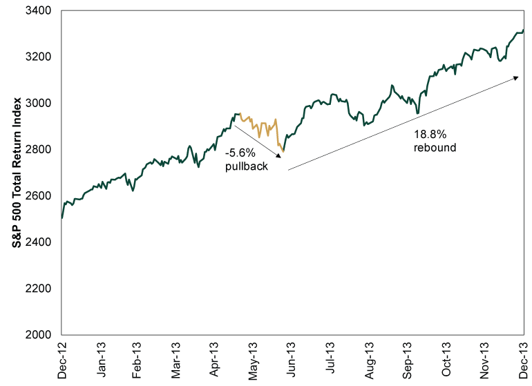 Molti esperti credevano che il mercato azionario potesse ritracciare in modo profondo. Invece, il Dow Jones Industrial Average (DJIA) ha registrato solo cali temporanei a metà del 2013. Il ritracciamento dell’S&P è stato abbastanza nella media (5.6%).
