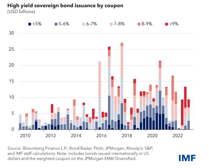 I tassi di interesse più elevati rappresentano una sfida anche per i governi. I paesi di frontiera e a basso reddito stanno avendo difficoltà a contrarre prestiti in valute come il dollaro americano, l’euro, lo yen e la sterlina britannica poiché gli investitori stranieri richiedono rendimenti maggiori. Quest’anno, le emissioni di obbligazioni in valute forti sono avvenute a tassi di interesse molto più elevati.