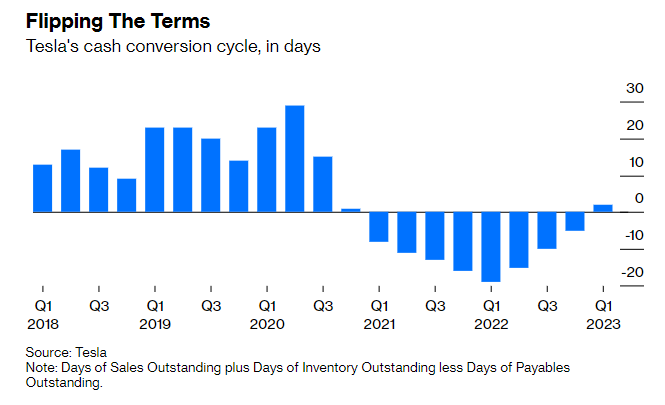 Il conseguente inventario gonfio ha invertito il ciclo di conversione in contanti favorevole di Tesla. Questo era diventato negativo all’inizio del 2021, il che significa che Tesla veniva finanziata in parte dai suoi fornitori. In questo trimestre, quella misura è tornata in territorio positivo, alimentando un grande vento contrario al capitale circolante e spingendo il flusso di cassa libero al livello più basso in quasi tre anni.