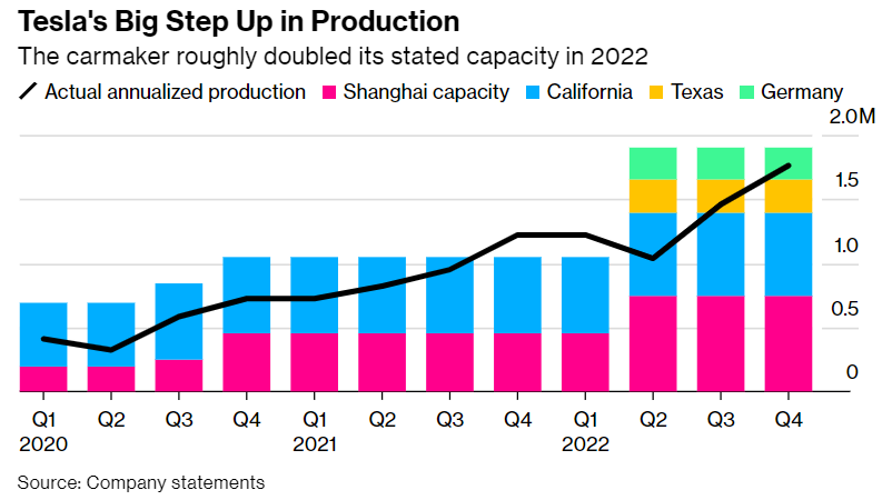 L’amministratore delegato Elon Musk ha affermato che le prospettive sono prudenti. Senza interruzioni impreviste, la produzione potrebbe avvicinarsi a 2 milioni di veicoli nel 2023.