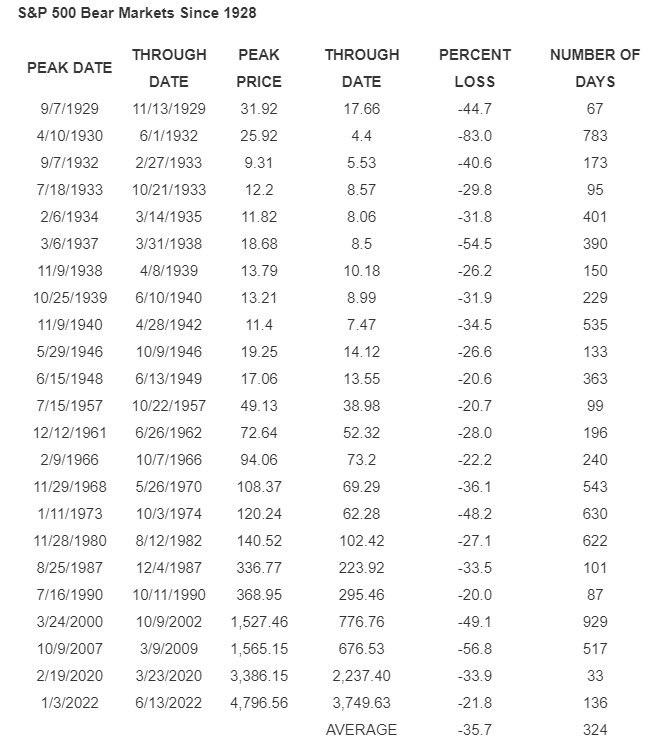 Se c’è una cosa che possiamo dire con certezza, è che i mercati ribassisti tendono ad andare e venire abbastanza rapidamente. Dal 1929, la durata media dei mercati ribassisti è stata di 324 giorni, ovvero circa 10 mesi e mezzo. Il mercato ribassista più lungo è stato quello della bolla di internet, esasperato dall’11 settembre e dallo scandalo Enron. Quello più corto (33 giorni), si è verificato nel 2020.