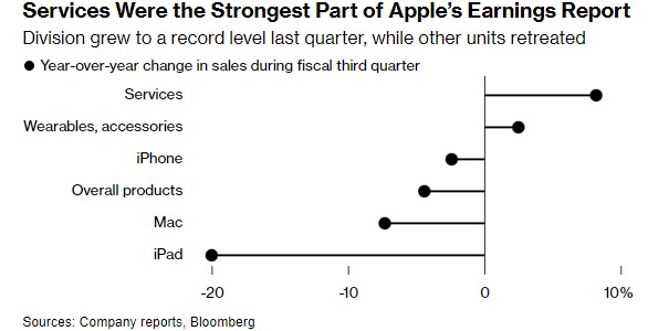 Le vendite di iPhone sono scese del 2,4% a $ 39,7 miliardi nel terzo trimestre, rispetto a una stima di $ 39,8 miliardi. I dirigenti di Apple hanno ammesso che il mercato degli smartphone sta attraversando un rallentamento, in particolare negli Stati Uniti. L’azienda conta sul dispositivo per oltre la metà delle sue vendite annuali.