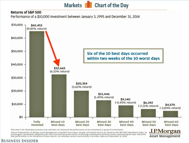 Dallo studio del passato possiamo concludere che rimanere completamente investiti porta a rendimenti maggiori. Se un investitore fosse rimasto completamente investito nell’S&P 500 dal 1995 al 2014, avrebbe avuto un rendimento annualizzato del 9,85%. Se invece fosse uscito dal mercato perdendo i dieci giorni migliori durante lo stesso periodo, i rendimenti annualizzati sarebbero scesi al 6,1%.