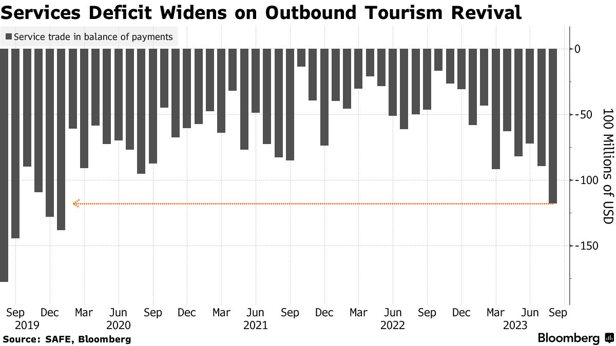 La Cina ha un deficit perenne nel commercio di servizi poiché il numero di cittadini continentali che viaggiano all’estero supera il numero di visitatori nel paese. Il deficit è peggiorato il mese scorso a causa di un aumento del turismo in uscita durante la stagione delle vacanze estive. Nonostante il Paese abbia completamente abbandonato le restrizioni Covid, i turisti stranieri devono ancora tornare in massa.