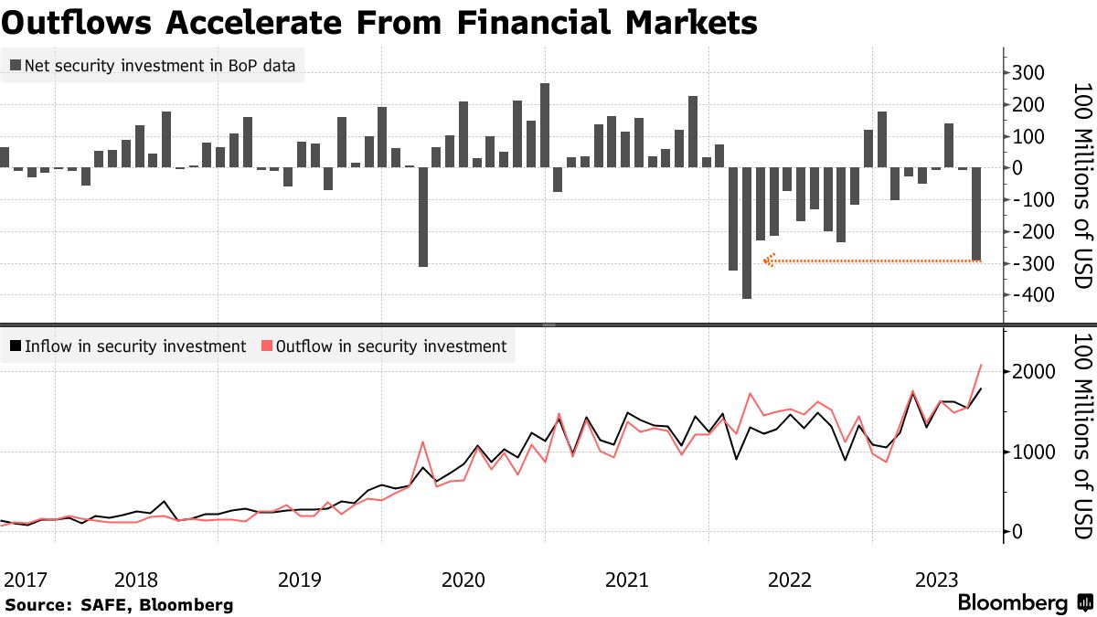 Dei 49 miliardi di dollari in uscita dal conto capitale e finanziario il mese scorso, più della metà provenivano da investimenti in titoli. Anche se gli afflussi sono aumentati, una quantità ancora maggiore di deflussi ha spinto il saldo in rosso.