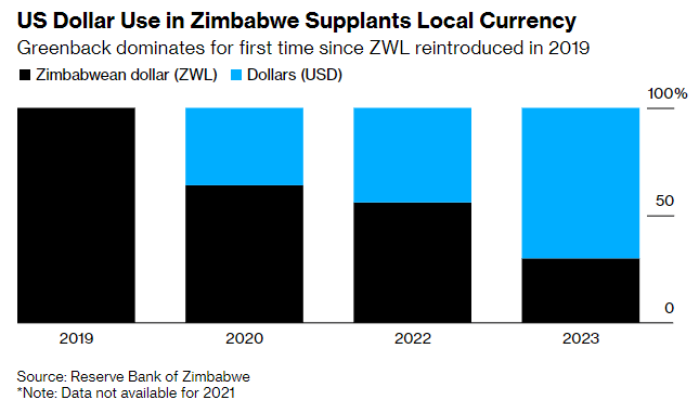Il biglietto verde ha sostituito per la seconda volta il dollaro dello Zimbabwe come valuta più utilizzata nella nazione, quasi quattro anni dopo la reintroduzione dell’unità locale. Il dollaro americano è stato utilizzato per il 77% delle transazioni quest’anno, secondo i dati raccolti dalla Reserve Bank of Zimbabwe.